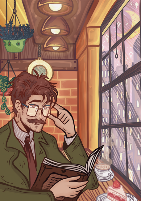 My idea for the illustration was to focus on the character "Harvey" from the video game. Harvey is a pharmacist/doctor running his own independent clinic/shop within the game; I would take this idea and make my piece about it before he becomes a doctor. Therefore, he would study for med school at his favourite coffee shop within the piece. I decided to make him study there rather than in his room (e.g.) because within the game, his favourite "gift" would be coffee, as you can give characters in the game presents to become friends with them. The mods (leaders of the project) loved my idea as not many people had thought to illustrate Harvey from the video game, making my piece stand out more.