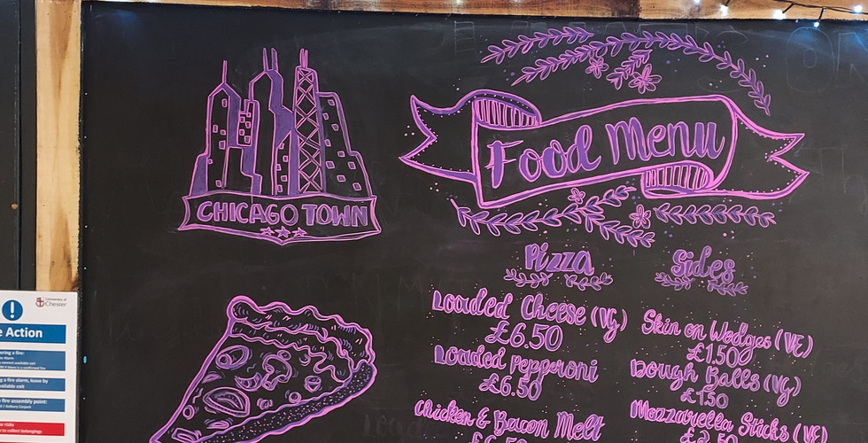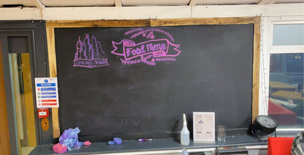 Another reason why it took longer than expected was that I had to completely redo some sections of the menu. My perspective was off when writing the menu, causing me to run out of space and having no room to include additional food options. So if students just looked at the chalkboard for the food menu, they wouldn't know all the possibilities they could have to eat. I could have just left it, but I didn't want to be lazy when creating this piece because I was learning a new medium and creating something for the SU bar (so a live brief, in a way). Despite it being tiring and wanting to be finished, my perfectionism took over. I started that section again to fit all the menu whilst adjusting the illustrations to make them appear less rushed.