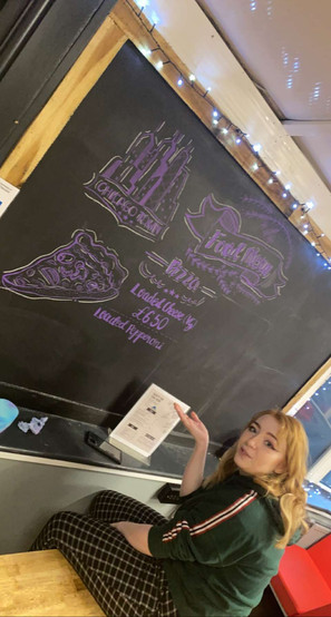 I also forgot to mention within my main explanation behind this project that I initially used white chalk instead of the pink chalk marker for the outlines. I did this so that the purple could stand out more as there were legibility issues with just the single colour. On the other hand, because the white chalk wasn't a POSCA marker like the purple was, it could be smudged quite quickly and had a texture that didn't fit in with the overall chalk drawing. This led me to change to the pink POSCA marker, which ended up being better because it made the chalkboard pop more in colour, making it more eye-catching for the students when they entered the bar.